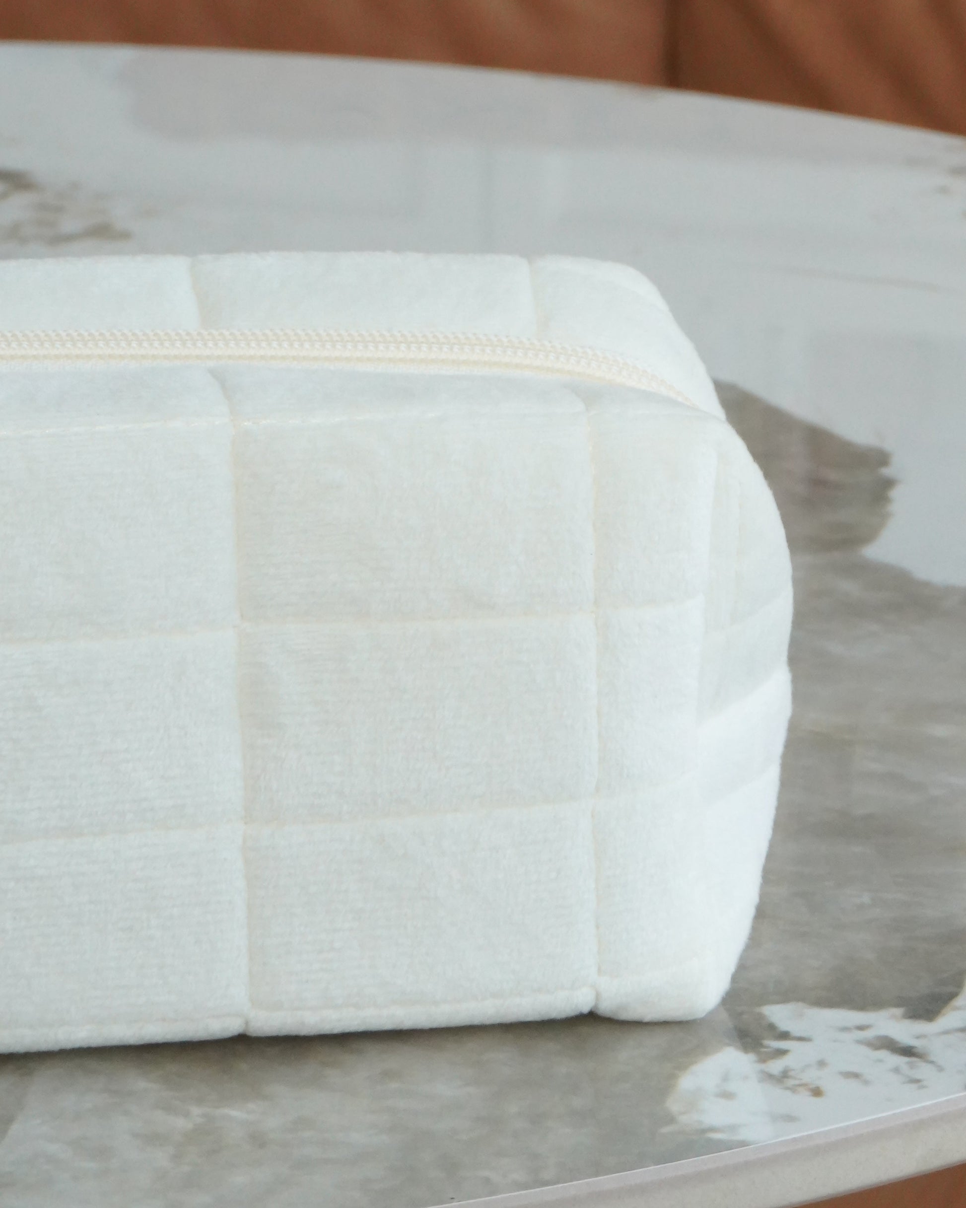 Almond Velvet Case er en smuk og kompakt letvægts kosmetiktaske i det blødeste cremefarvet velour. Rummelig nok til dine beauty-essentials — kompakt nok til at tage med overalt.