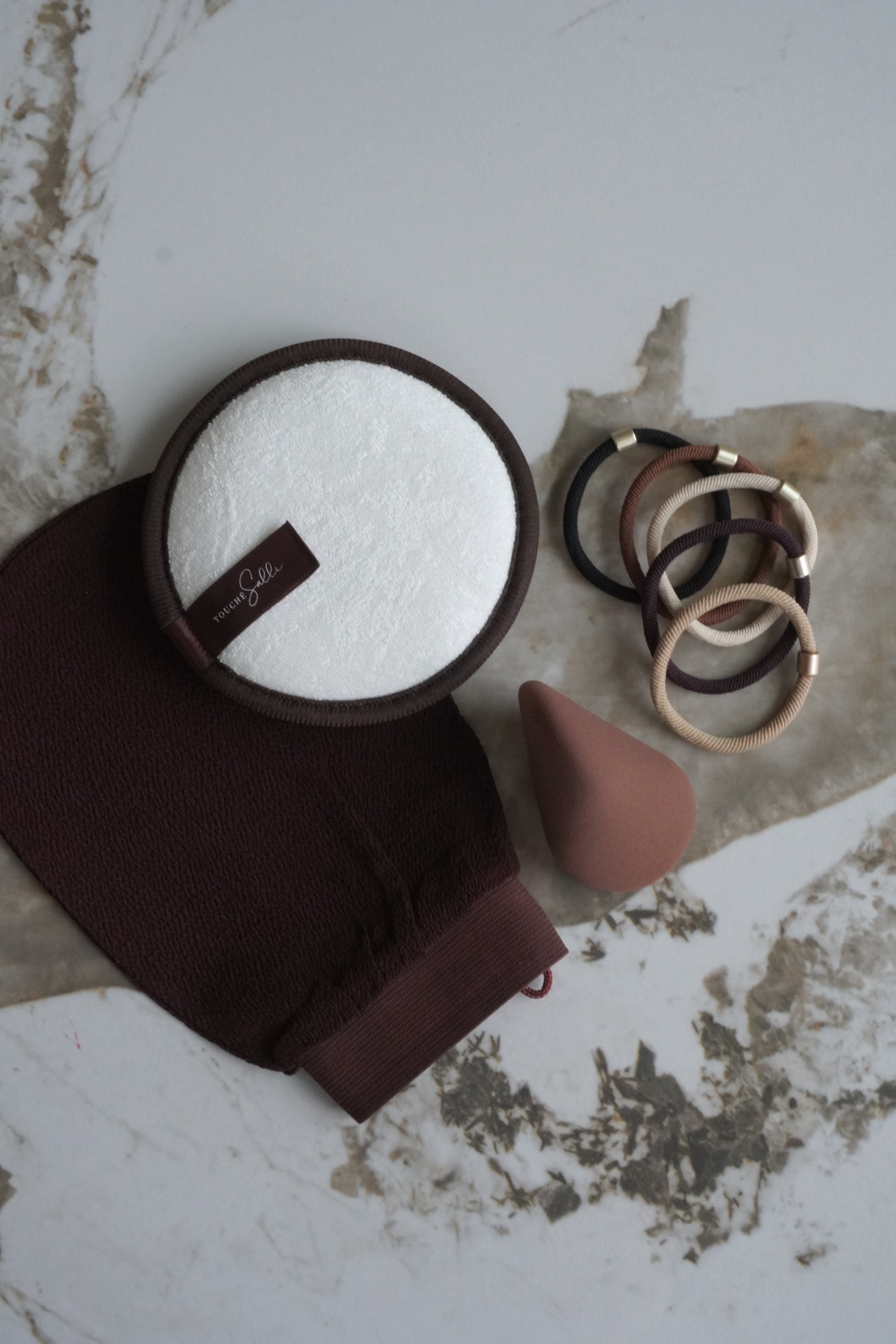Corpo Glow Exfoliating Mitt leveres i en hvid flatbox er omsluttet af et beige omslag i træfrit papir – fremstillet af restprodukt fra sukkerrør. En lille fortælling om skønhed i det, der bliver til overs.
